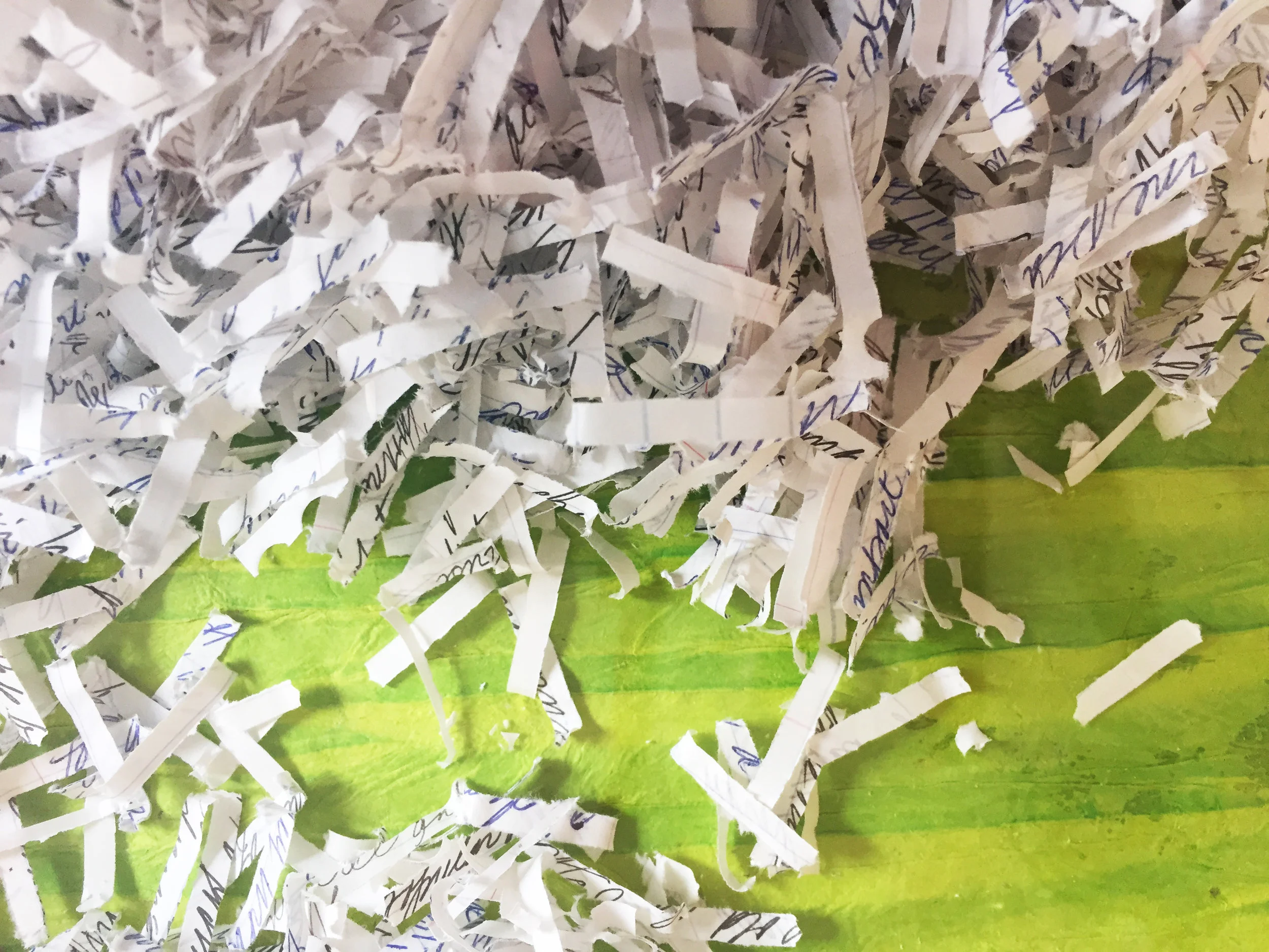 Extremely Private, Triptych, each 12 x 12 x 2.5", paper shredded from the artist's personal journals, rice paper.